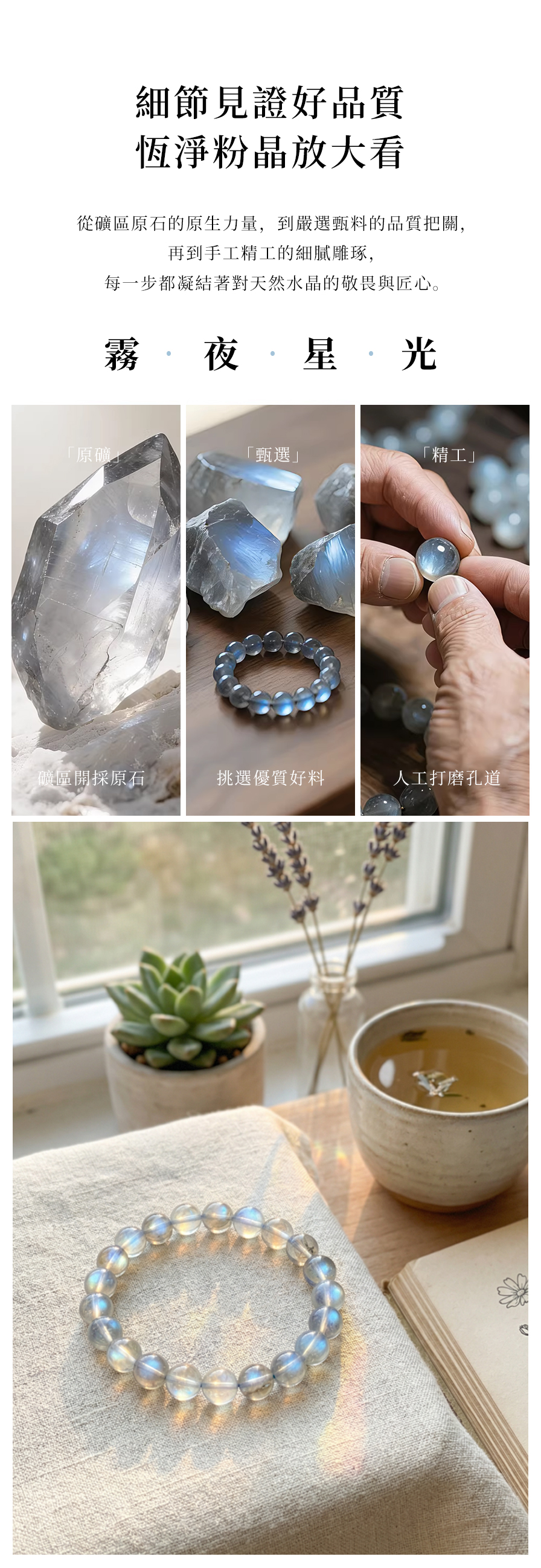 我们不只卖珠子,更希望传递每一块矿石背后的地质故事与疗愈哲学。每一批矿石,我们都尽可能追溯矿区源头,希望当你戴上它时,能感受到地球亿万年的沉淀与内心的平静 。